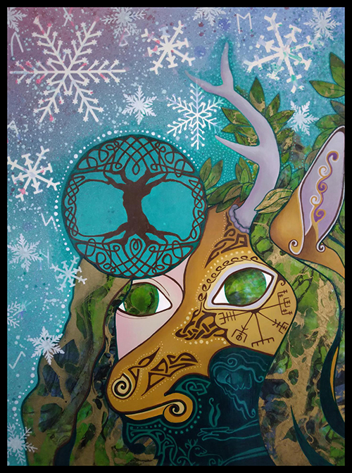 I settled on an image, and placed it into Photoshop in the size dimensions I needed to fit the support and general design. I wanted a more otherworldly lighting effect and played with the PS settings until I got close to what I wanted. It is printed on mulberry paper via my Cannon Pixma, fixed and glued on to the support. Acrylic glazes were used to heighten color, diminish certain areas, outline and define. I was thinking in terms of the tree of life – Yggdrasil, and sacred geometry. All the paper I used was cut out with a small pair of scissors and a exacto blade.