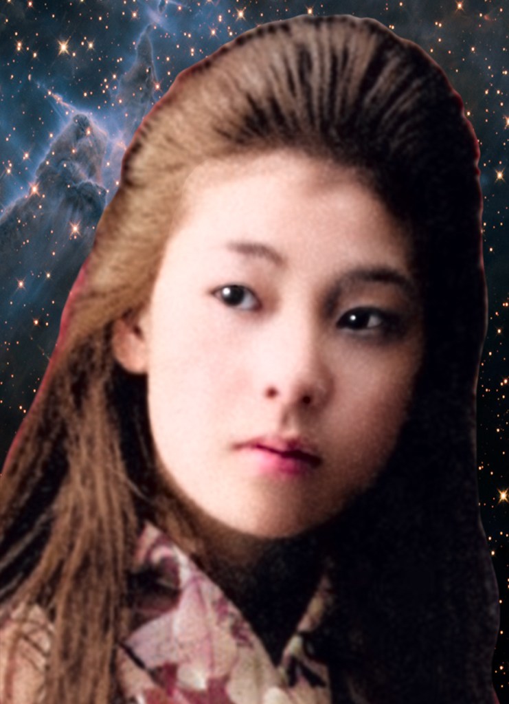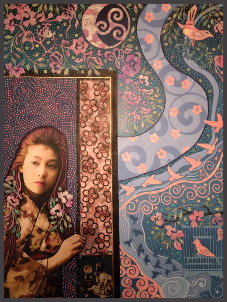 I finished my latest artwork a couple weeks ago – gardening has taken priority, getting my yard ready for summers glorious production. So, the making of art. This latest piece includes a female image that is AI generated via Photoshop. I had been playing around with it and decided to see how it would work in an mixed media piece.